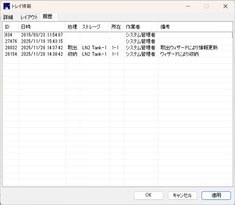 トレイは登録後ほぼ編集できないため、履歴は収納・取出に関する記録がほとんどとなります。履歴の出力機能はありません。