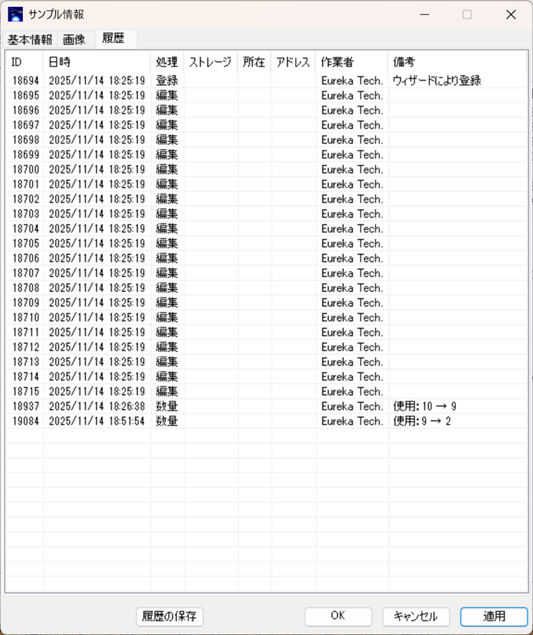 数量管理の履歴のほとんどは、サンプルの履歴の一部として記録されています。 編集履歴は記録されていますが編集内容が出力されていないため、いつ登録されたか、いつ何個使用されたかの履歴のみが有用な情報と言えます。