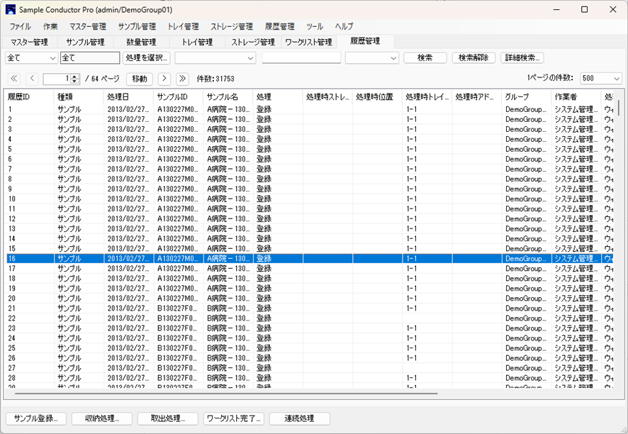 サンプルは登録数が多く履歴も多岐にわたるため、目的によって「履歴管理」タブと使い分けてご利用ください。