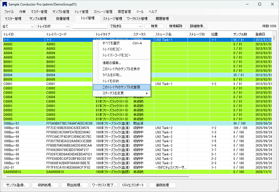 対象のトレイを選択して「サンプルの整理」を実行します。