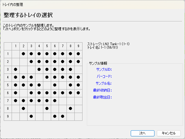 トレイ(保管用のボックスやトレイ)内のサンプルは、収納と取出処理を続けているとランダムに空き場所が目立つようになります。SCPでは、このトレイ内のサンプルを整理することができます。